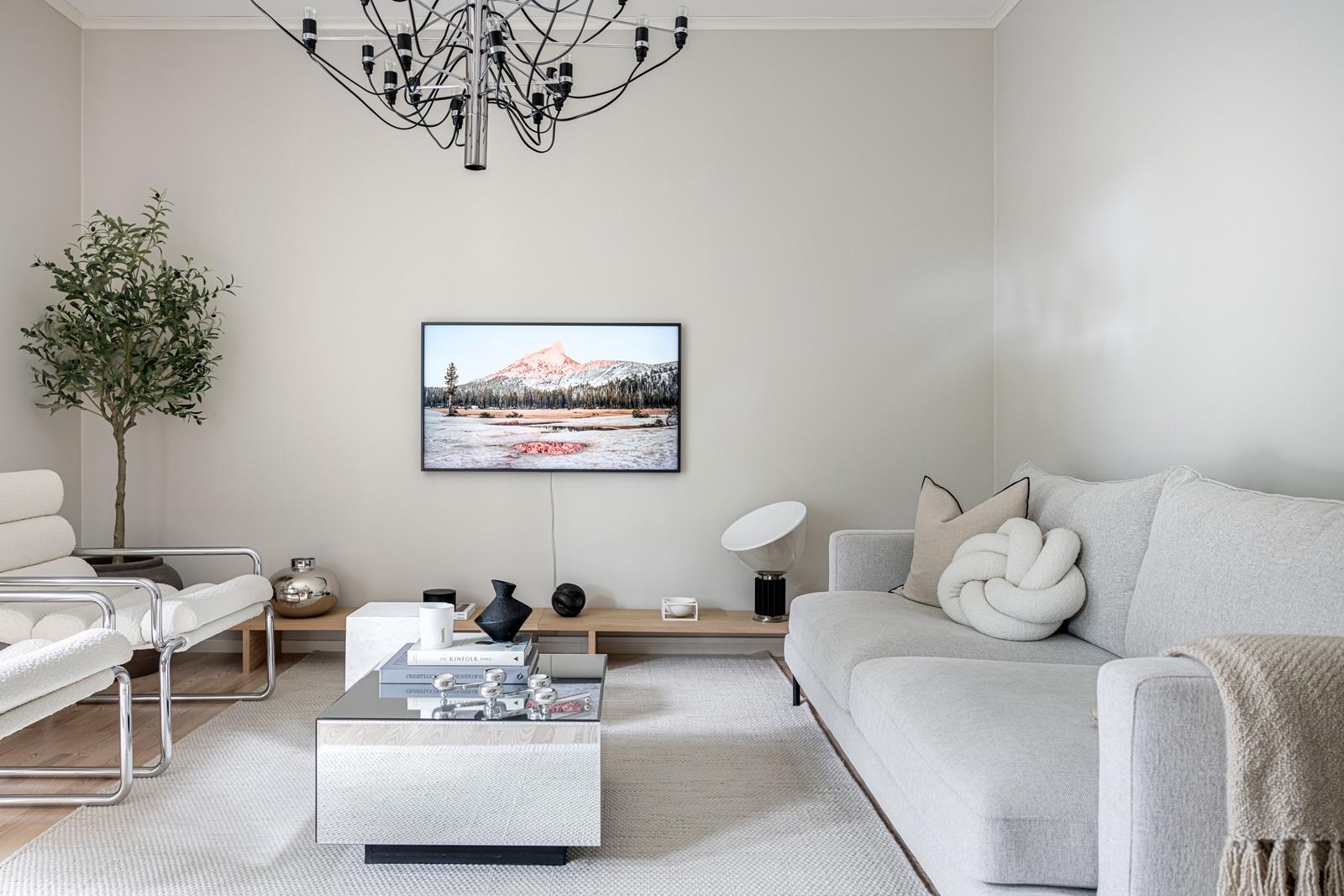 Väggarna går i en elegant ljus beige/grå nyans som bidrar till den harmoniska känslan.