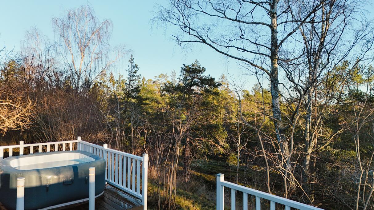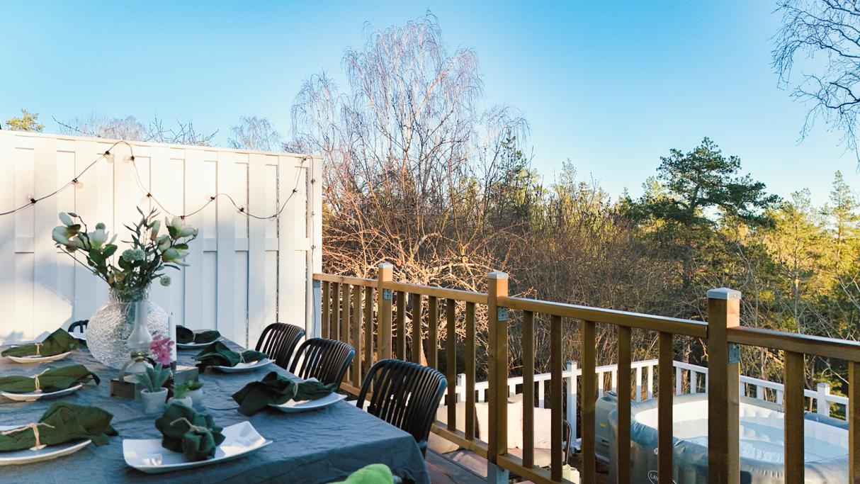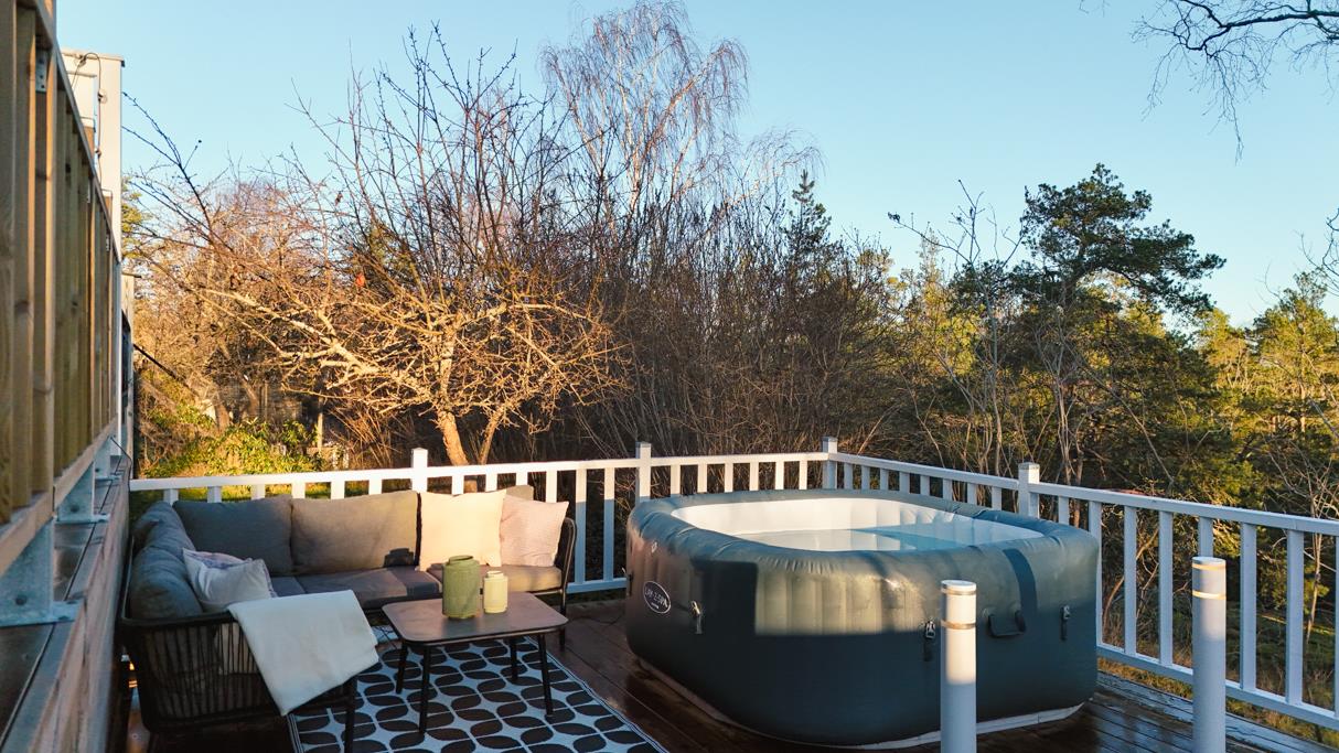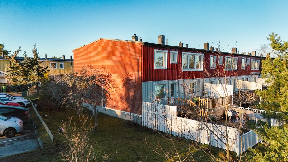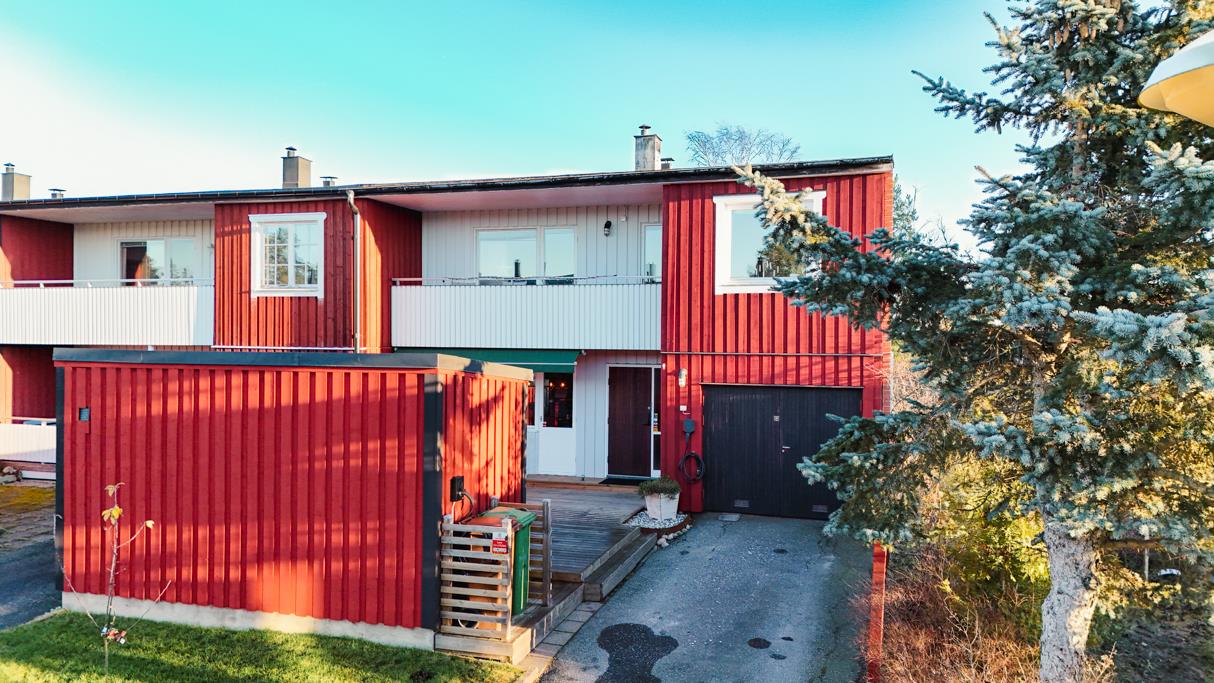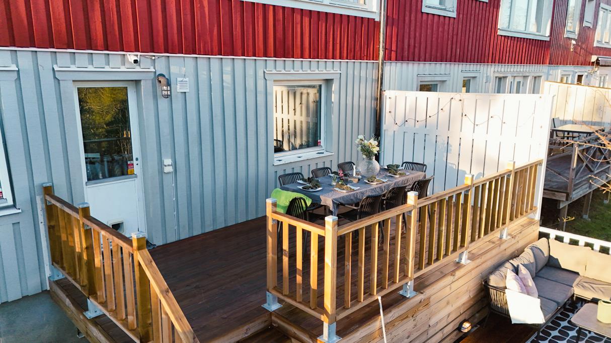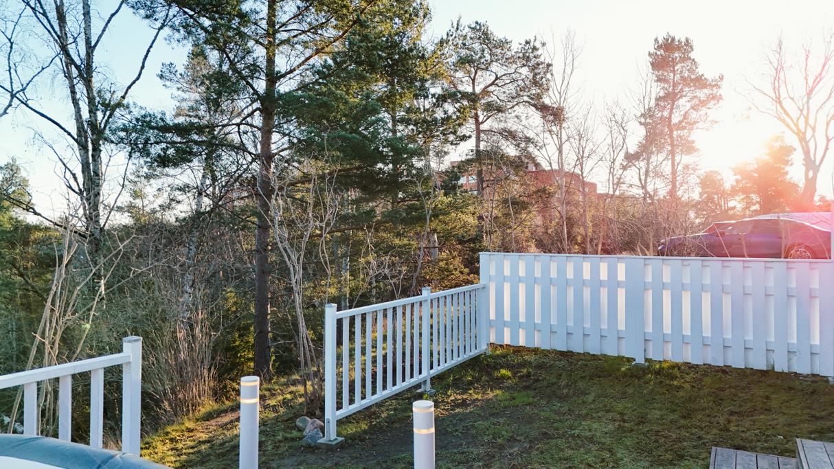 Trivsam utemiljö med altan på både fram- och baksida, nytt staket, ny gräsmatta och äppelträd. Som gavelhus erbjuds en känsla av avskildhet och baksidan vetter dessutom mot ett skogsparti.