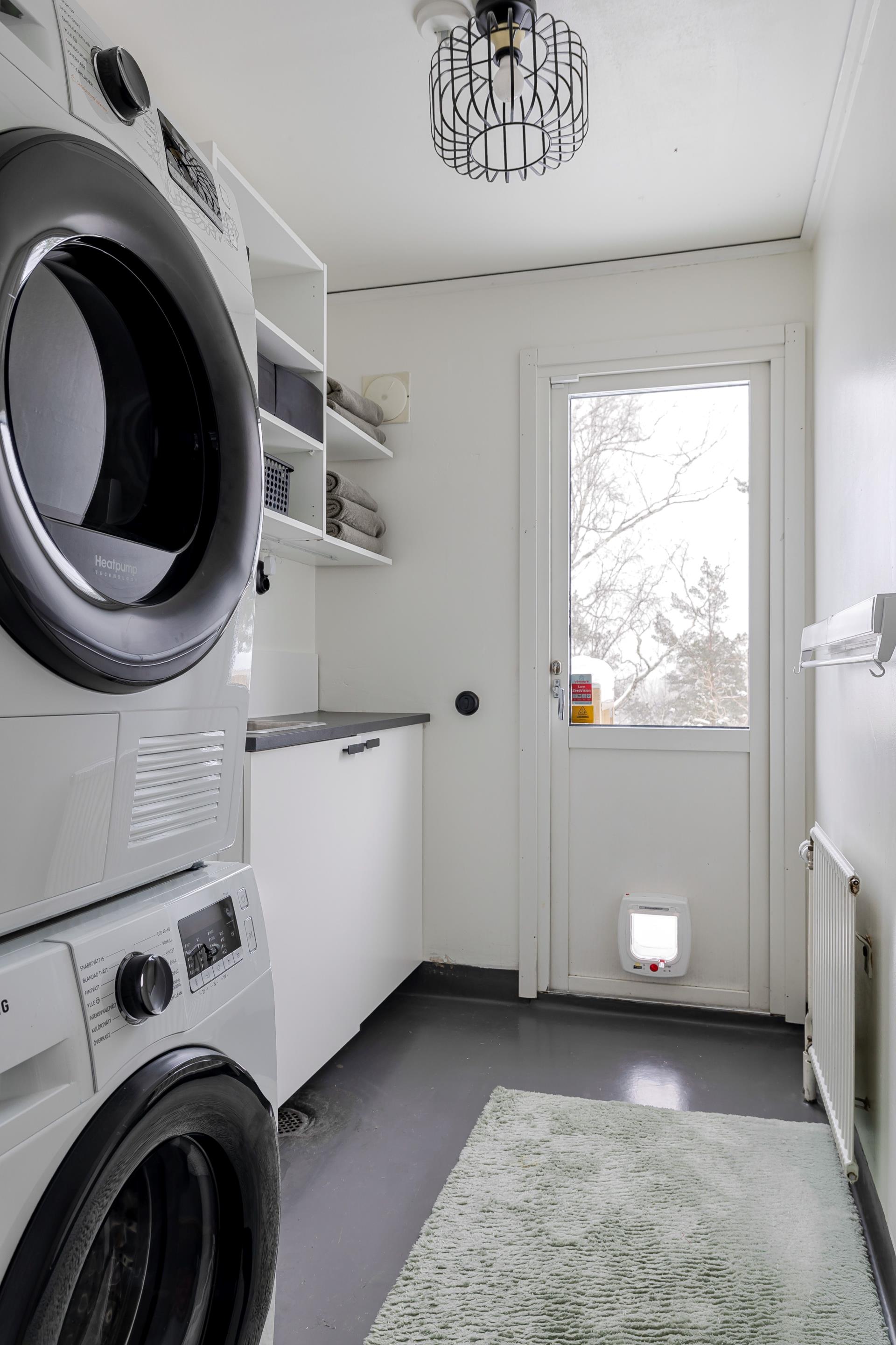 På framsidan av huset finns ett rymligt förråd samt garage inbyggt i huset samt uppfarten med plats för två bilar.